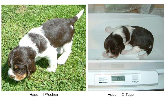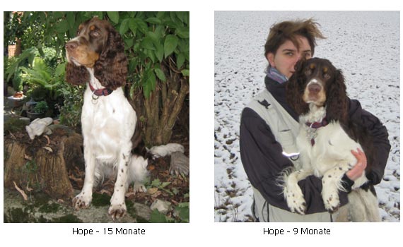 SPORTY SPRINGERS AGILITY HOPE Als ich von Yvonne gebeten wurde, etwas über Sporty Springers Agility Hope zu schreiben, dachte ich es würde mir leicht fallen. Ich musste aber schnell feststellen, dass dies doch nicht so einfach ist. Ich beginne deshalb mit einem kurzen Rückblick... Als ich 2000 meinen ersten Hund (Aileen just for Fun "Finwe") bekam, war mein Wunsch einen unterwürfigen, verschmusten Hund zu bekommen, der auch noch sportbesessen sei. Ich bekam einen äußerst eigensinnigen und käuflichen Hund. Nach 3 Jahren hielt ich mich nach einer Menge Frustration für fähig, einen weiteren Hund zu führen, da ich glaubte nun allen Eventualitäten gewachsen zu sein. Als Hope dann zu mir kam, wurde schnell klar, dass dieser Hund genau das ist, was ich mir schon beim ersten Springer so sehr gewünscht hatte. Sie ist unglaublich anhänglich, liebt engen Körperkontakt und ist zärtlich. Sie liebt alle Aktivitäten, besonders schnelle Aktionen wie Agility. Dabei ist sie unermüdlich und lernt gern und schnell. Hope